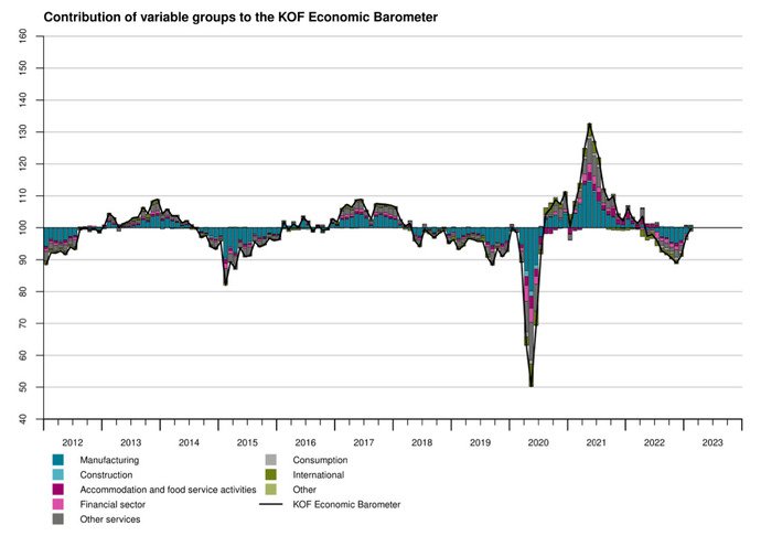 L’insieme delle variazioni di tutti i gruppi dalla rispettiva media di gruppo più 100 dà come risultato il valore del Barometro economico del KOF.