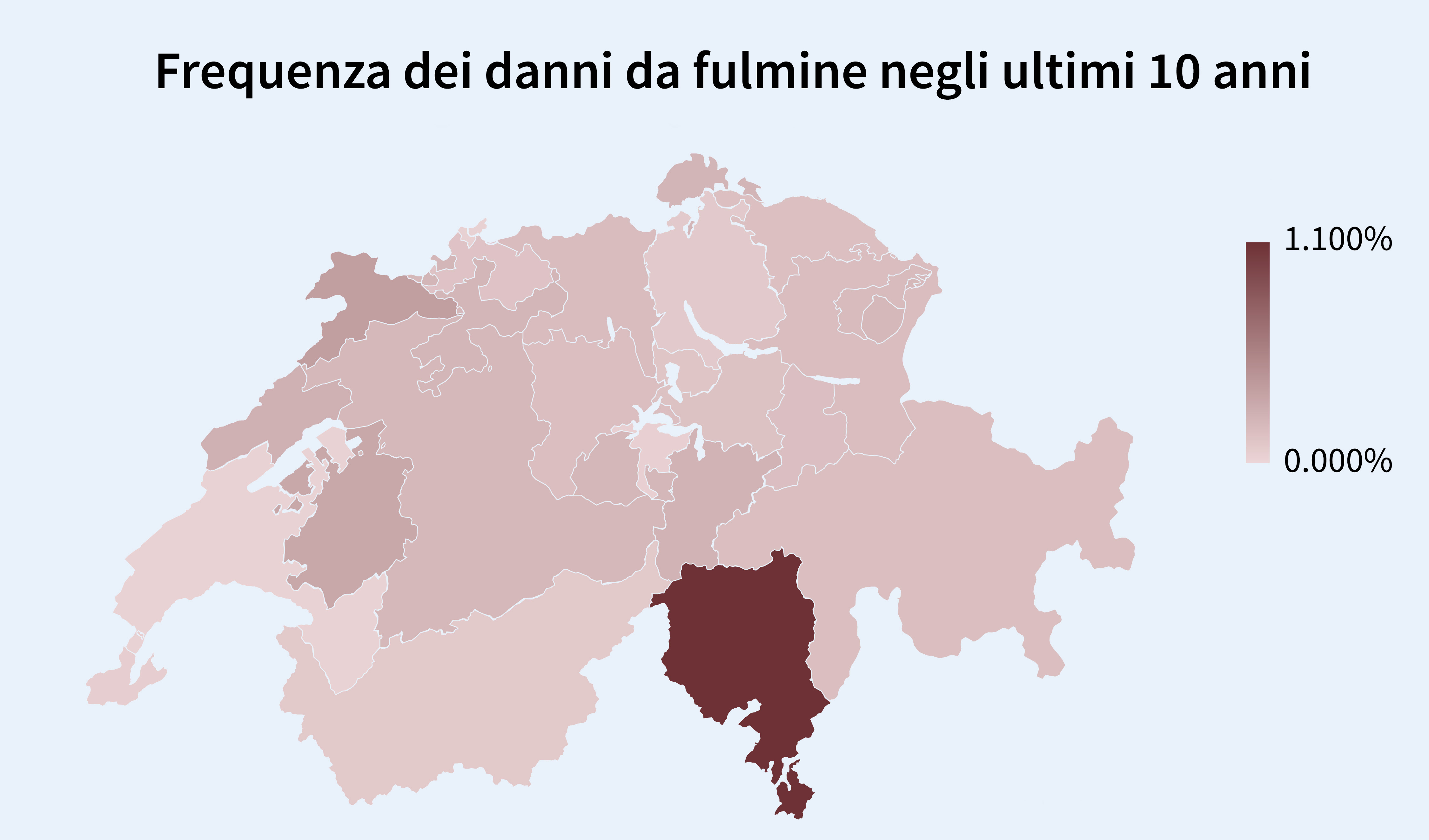 Al primo posto delle statistiche per quanto riguarda i danni causati da fulmini, troviamo il canton Ticino, dove questo tipo di danni si è verificato otto volte in più rispetto al resto della Svizzera. Il motivo è presto detto: quando l’aria caldo-umida del Mediterraneo proveniente dal sud viene sbarrata dalla catena alpina, si formano nuvole temporalesche con forti correnti ascensionali e discensionali e cariche elettriche. I cantoni di Vaud e Basilea Città hanno invece registrato il minor numero di danni legati a questo fenomeno meteorologico.